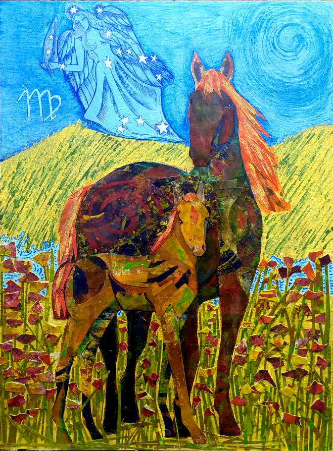 Virgo Mustangs 18″ x 14″ Mixed Media Collage on Wood